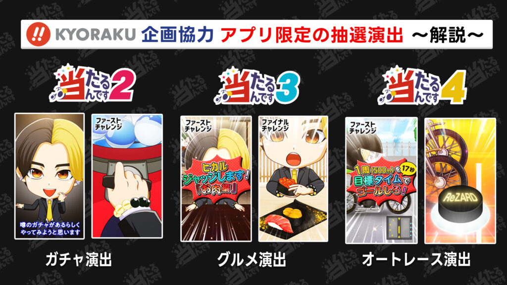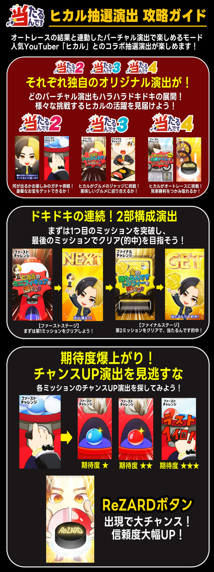 人気YouTuber「ヒカル」が様々なミッションを繰り広げる演出が楽しめます!見事ミッションクリアで「当たるんです」的中!(当たるんです2・3・4でそれぞれ演出が異なります。)