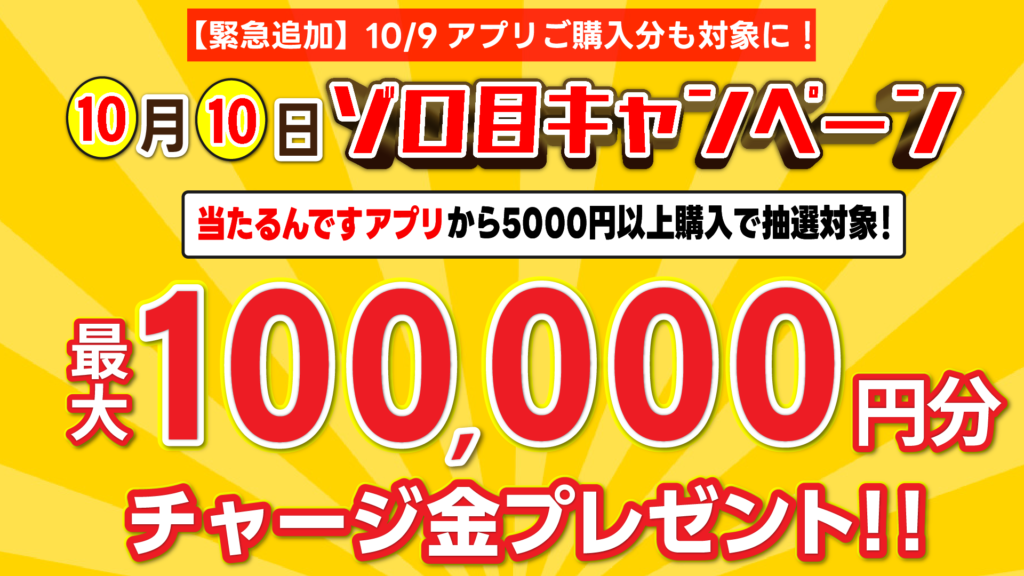 キャンペーン期間中 、当たるんです公式アプリより「当たるんです」を種類問わず、合計5000円分以上ご購入された方の中から、抽選で最大100,000円分のチャージ金プレゼント!
