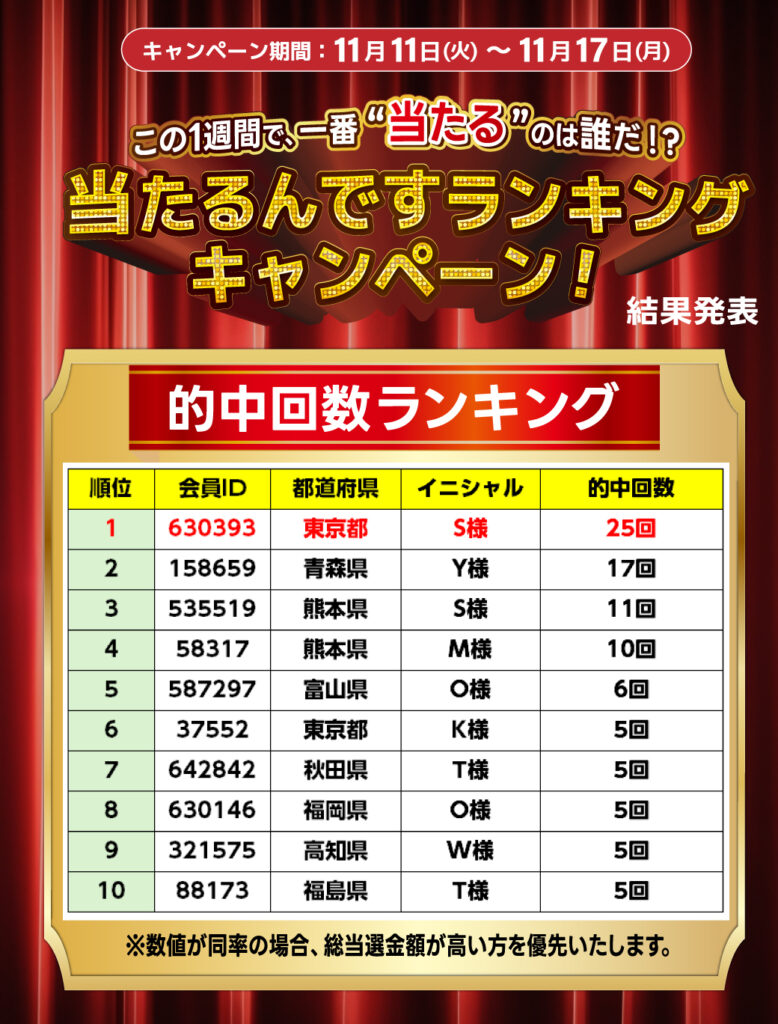 ※的中回数が同率の場合、総払戻金額・又は総購入金額で順位が確定いたします。総当選金が同率の場合、的中回数・又は総購入金額が順位が確定いたします。
